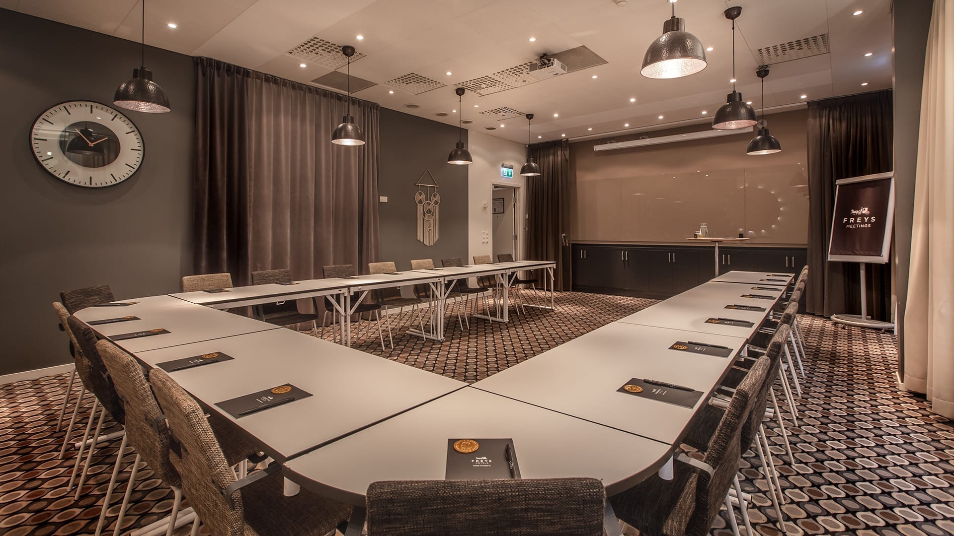 På Freys Hotels mysiga konferensavdelning finns nio unika konferensrum och inget är det andra likt. Våra lokaler är designade för att passa din agenda. Här arbetar ni ostört, oavsett om ni är två eller 50 personer. Hos oss finns möjlighet att boka hela konferensvåningen om 220 kvm, för upp till 150 personer. Välkommen till oss för möten, events eller arrangemang i exklusiv avskildhet.